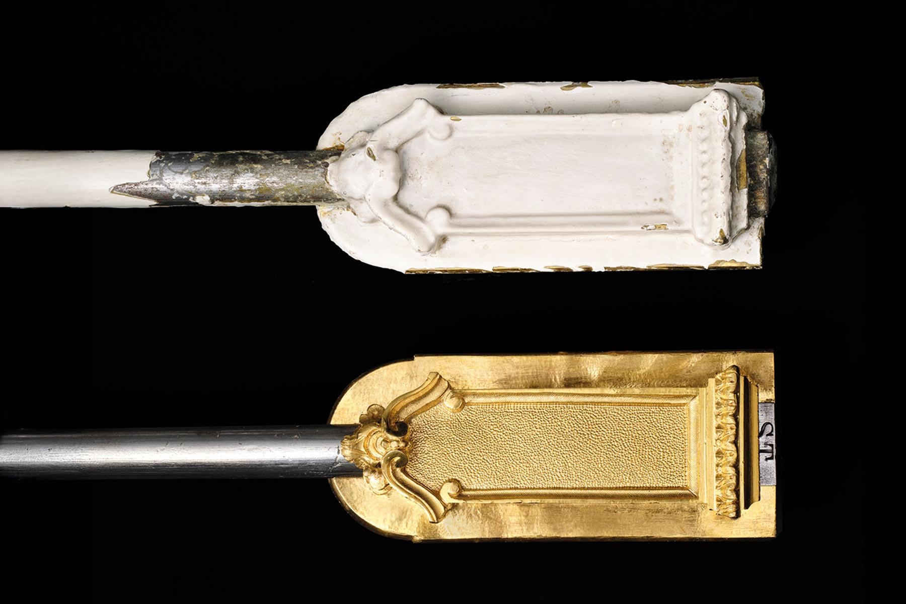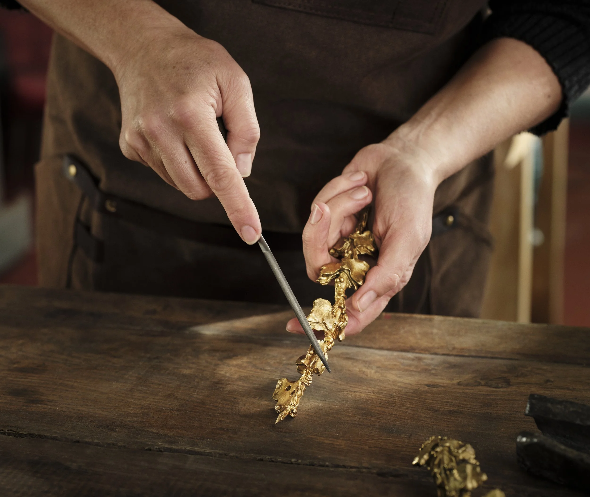 L’atelier exclut tout recours à des procédés industriels, souvent responsables de dégradations irréversibles. Les traitements de surface — ciselure, dorure, argenture et patines — sont réalisés dans le respect des gestes et des savoir-faire traditionnels, afin de restituer l’authenticité et la profondeur des pièces restaurées.